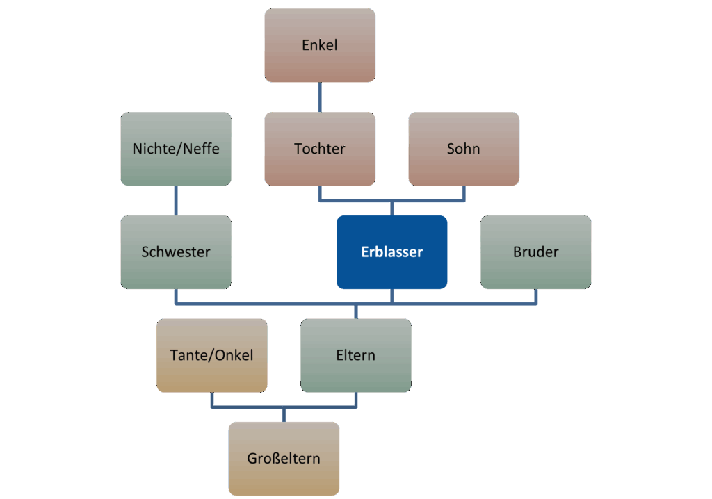 Nach dem Gesetz werden die Erben in verschiedene Ordnungen eingeteilt. Gemäß § 1930 BGB löst jede dieser Ordnungen eine Sperrwirkungen aus. Solange ein Verwandter einer vorhergehenden Ordnung vorhanden ist, kann ein Angehöriger einer nachfolgenden Ordnung nicht Erbe werden. Die Einteilungen der Ordnungen finden sich in den §§ 1924 ff. BGB. So gehören zu den Erben 1. Ordnung die Abkömmlinge des Erblassers, das sind die Kinder, Enkel und Urenkel.